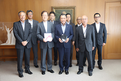 藤吉工業株式会社様(代表取締役社長 加藤靖始様をはじめ 滝浩之様、島田吉幸様、高橋裕司様)にお越しいただきまして、理事長より感謝状を贈呈いたしました。
